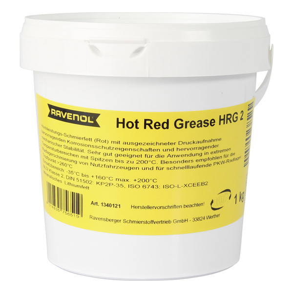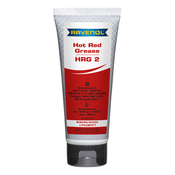 RAVENOL Hot Red Grease HRG2 — bu qizil rangdagi avtomobil surkovchi moy bo‘lib, mineral bazaviy moy asosida ishlab chiqarilgan va litiyli sovun bilan qotirilgan. U avtomobillar, mexanizmlar, qurilmalar, konveyer tizimlari, qurilish texnikasi va boshqa uskunalarning sirpanma va aylanuvchi podshipniklarini moylash uchun mo‘ljallangan bo‘lib, yuqori haroratlarda ishlashga moslashtirilgan. Moy oqib ketishga barqaror, zang va korroziyaga qarshi himoyaga ega.