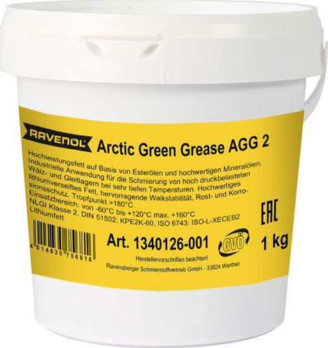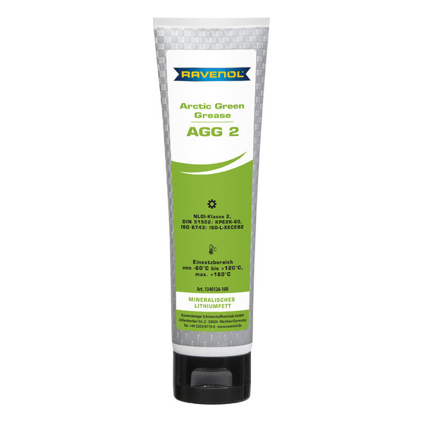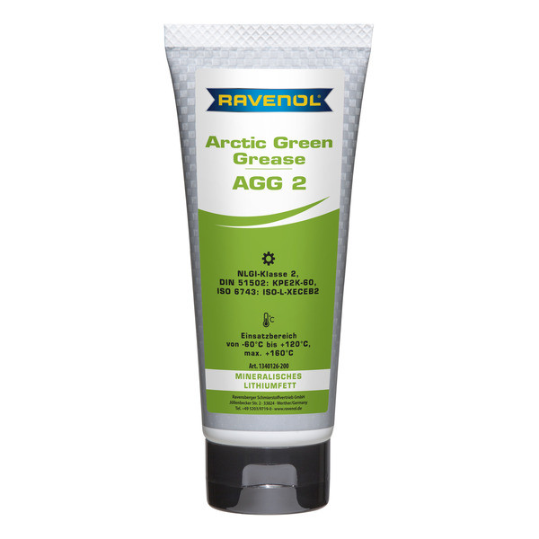 RAVENOL Arctic Green Grease AGG 2 - to‘liq sintetik, sintetik komponentlar (esterlar) asosida maxsus ishlab chiqilgan, mineral moy qo‘shilgan, zagustiteli litiy sovuniga asoslangan surkov moyidir.