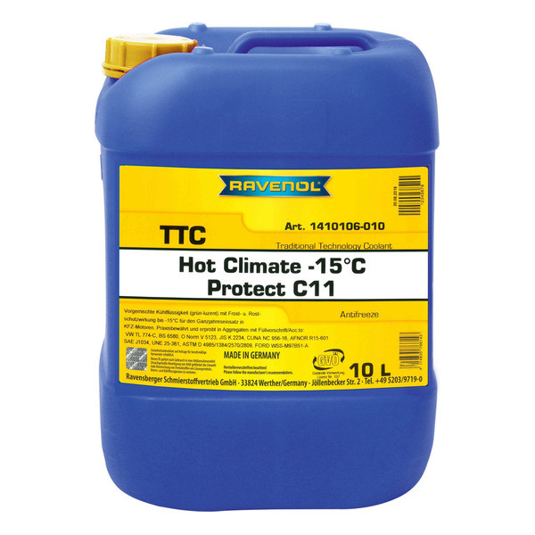 RAVENOL TTC Trad. Techn. Coolant HOT CLIMATE -15°C is a ready to use, prediluted with water, ethylene-glycol based and time-tested coolant without phosphates, nitrites and amines. This product is formulated based on a proven inhibitor development as an extended life radiator antifreeze.