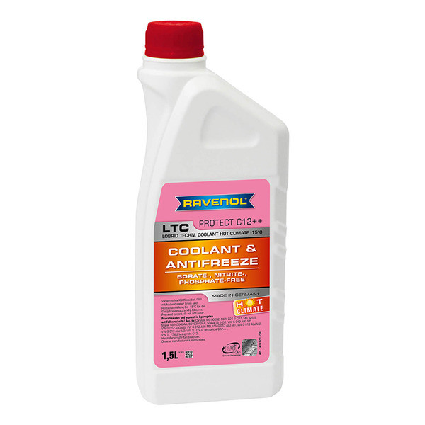 RAVENOL LTC HOT CLIMATE -15°C – monoetilenglikol asosida tayyorlangan, tayyor holda qo‘llaniladigan sovituvchi suyuqlik bo‘lib, eng so‘nggi ikki yo‘nalishli texnologiya asosida ishlab chiqilgan lobrid tipidagi antifrizdir (Lobrid Technology / SOAT Coolant). U karboksilat (OAT texnologiyasi) va mineral texnologiyaning (oz miqdordagi mineral inhibitörlar) afzalliklarini birlashtiradi.
