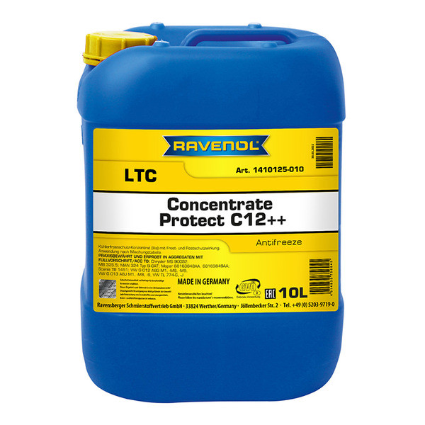 RAVENOL LTC Protect C12++ Concentrate – 1.2-Ethandiol (monoetilenglikol) va silikat asosidagi korroziyaga qarshi inhibitörlar bilan OAT (organik texnologiya) asosida ishlab chiqilgan sovituvchi suyuqlik kontsentrati. Tarkibida boratlar, nitritlar va fosfatlar mavjud emas. Alyuminiyli dvigatellarni yozda ham, qishda ham 5 yilgacha korroziyaga qarshi ishonchli himoya qiladi. Atrof-muhit uchun xavfsiz.