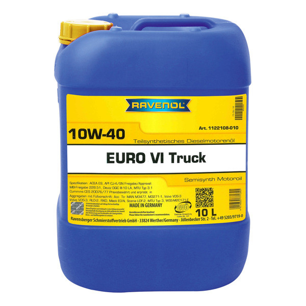 RAVENOL EURO VI Truck SAE 10W-40 – universal polusintetik motor moyi, maxsus tanlangan qo'shimchalar paketi asosida yaratilgan, yuk mashinalari uchun past miqdordagi sulfat kuliga (Low SAPS) ega va shuningdek, dizel dvigatellari uchun mo'ljallangan. EURO4, EURO 5 va EURO 6 dvigatellari uchun, shuningdek, past sulfidli dizel yoqilg'isi bilan ishlashda juda yaxshi mos keladi.
