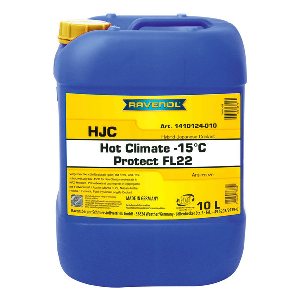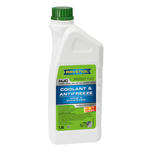 RAVENOL HJC Hybrid Japan.Coolant HOT CLIMATE -15°C is a ready to use, prediluted with water, ethylene-glycol based and time-tested coolant without amines and silicates. This product is formulated based on a proven inhibitor development as an extended life radiator antifreeze.