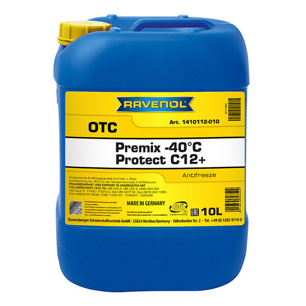 RAVENOL ETC Protect C12evo Premix -40°C – boratlar, nitritlar, fosfatlar tarkibida mavjud emas. Ichki yonuv dvigatellarining sovitish konturlari uchun mo‘ljallangan, 1.2-etandiol (monoetilenglikol) asosidagi sovituvchi suyuqlik bo‘lib, muzlash va korroziyadan himoya qiladi hamda texnik xizmat talab qilmaydi. Ushbu mahsulot zamonaviy Si-OAT texnologiyasi asosida radiatorni uzoq muddat himoya qilish uchun ishlab chiqilgan.