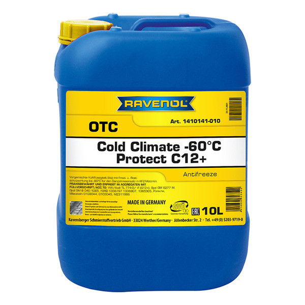 RAVENOL OTC COLD CLIMATE -60°C – oldindan suv bilan aralashtirilgan, tayyor holatda qo‘llaniladigan sovituvchi suyuqlik bo‘lib, silikatlar, boratlar, nitritlar va fosfatlar tarkibida mavjud emas. 1.2-Ethandiol (monoetilenglikol) asosida ishlab chiqilgan bo‘lib, OAT texnologiyasi va korroziyaga qarshi inhibitörlar qo‘llanilgan. Bu esa ekstremal past haroratli iqlim zonalarida ishlatilganda xizmat muddatini va himoya samaradorligini uzaytiradi.