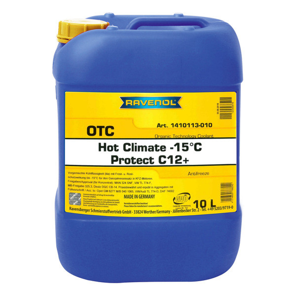 RAVENOL OTC Org. Techn. Coolant HOT CLIMATE -15°C is a prediluted coolant with frost and rust protection for year-round use in automotive engines.