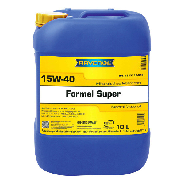 RAVENOL Formel Super SAE 15W-40 – mineral motor moyi, benzin va dizel yengil avtomobillari uchun, turbinali va turbinasiz motorlar hamda tijorat transporti uchun ishlab chiqarilgan.