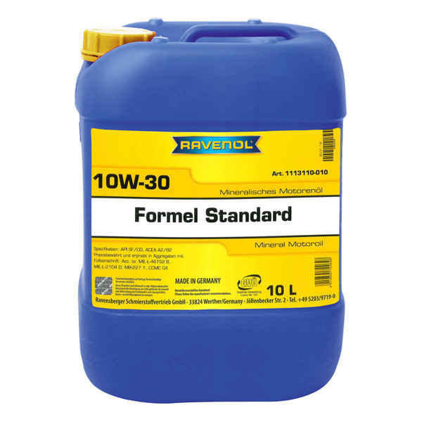 RAVENOL Formel Standard SAE 10W-30 – mineral motor moyi, benzin va dizel yengil avtomobillari uchun, turbinali va turbinasiz motorlar hamda tijorat transporti uchun ishlab chiqarilgan.