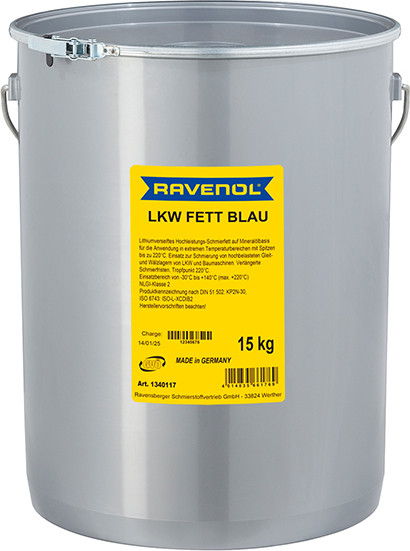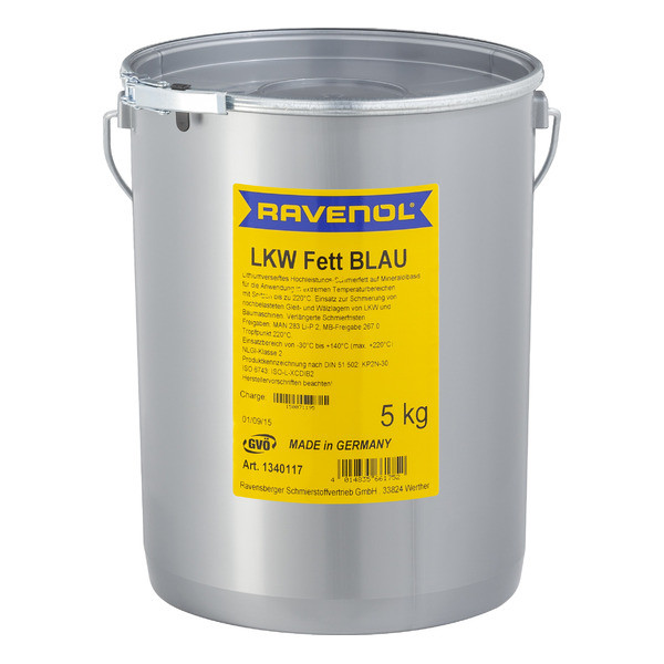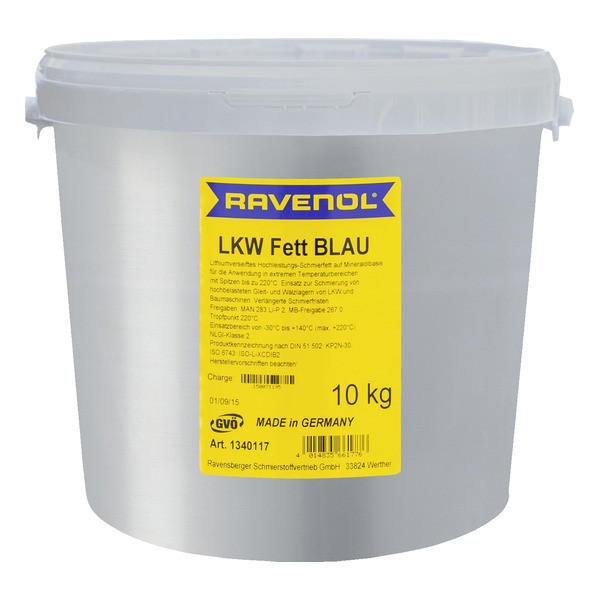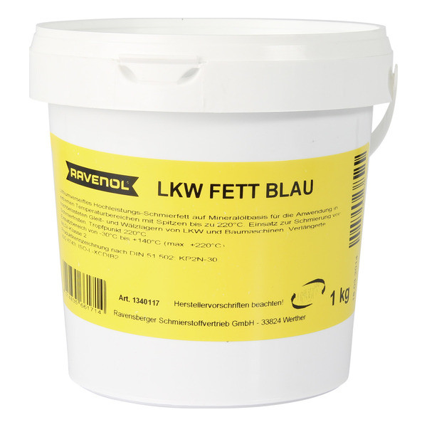 RAVENOL LKW Fett blau - mineral asosidagi, antioksidlovchi va korroziyaga qarshi qo‘shimchalar qo‘shilgan, litiy sovuni bilan zagustitellangan ko‘p funksiyali avto surkov moyidir.